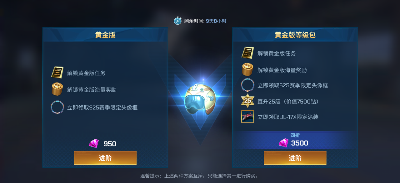 没时间刷等级?黄金版等级包(3500 钻石解锁海量奖励 + 直升 25 级)、黄金版任务(950 钻石开启,完成即领满奖)两种捷径任选!注意啦 —— 黄金版与等级包二选一,按需解锁不浪费,不管是纯肝党还是速通党,都能薅到专属空战福利!