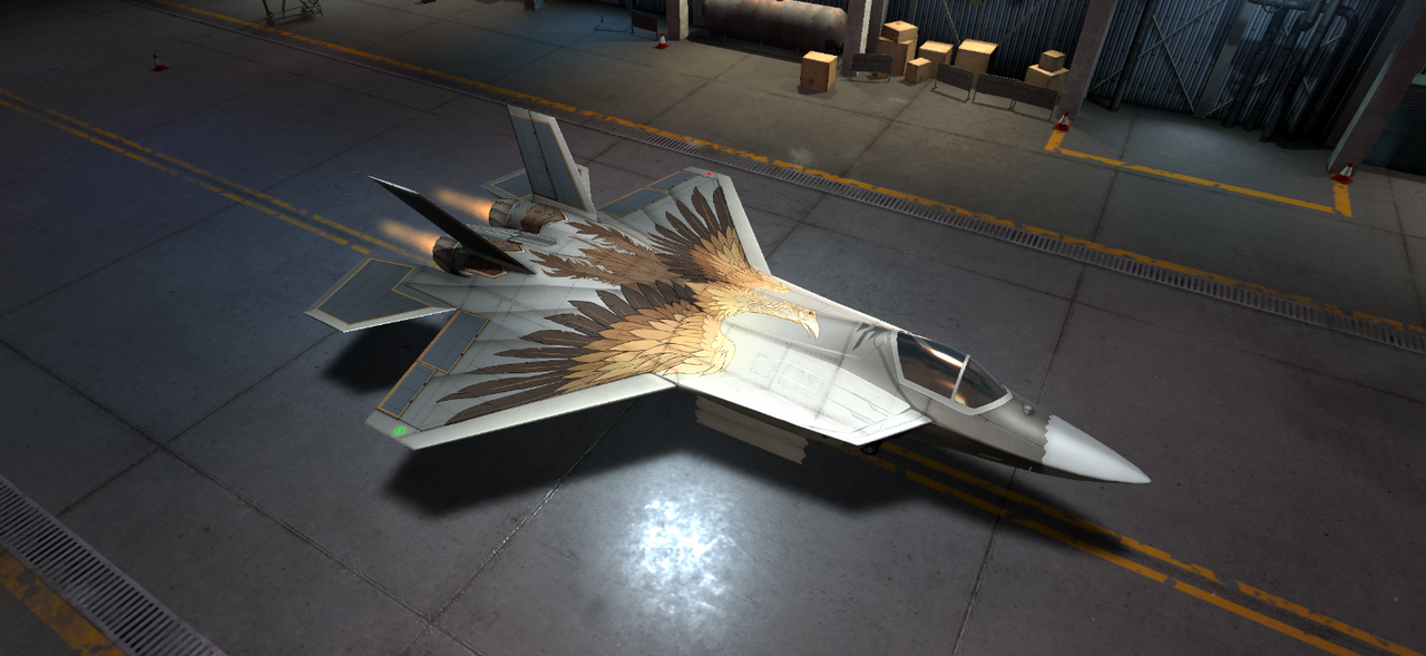 机身主体的 “金棕雄鹰” 图案堪称 “长空浮雕”:鹰羽采用金棕渐变处理,从深棕的翼根到浅金的羽尖,层层纹理模拟出羽翼的蓬松与力量感,每一片羽毛的边缘都用浅银线条勾勒,像金属锻造的翎羽,既保留了战机的工业冷感,又让雄鹰仿佛 “生长” 在机身上;鹰身周围的浅棕纹理如气流尾迹般蔓延,从机身向机翼、尾翼舒展,纹理边缘做了 “渐变虚化” 处理,模拟高速飞行时羽翼划破气流的动态张力,银灰底色上,羽纹区域还点缀着细微的 “风蚀” 斑点,像雄鹰在长空搏击中留下的痕迹,让 “苍穹之翼” 多了几分实战的厚重感。