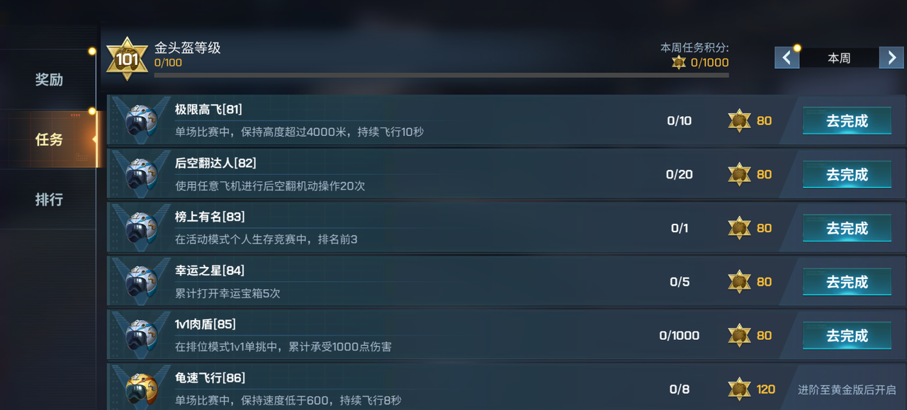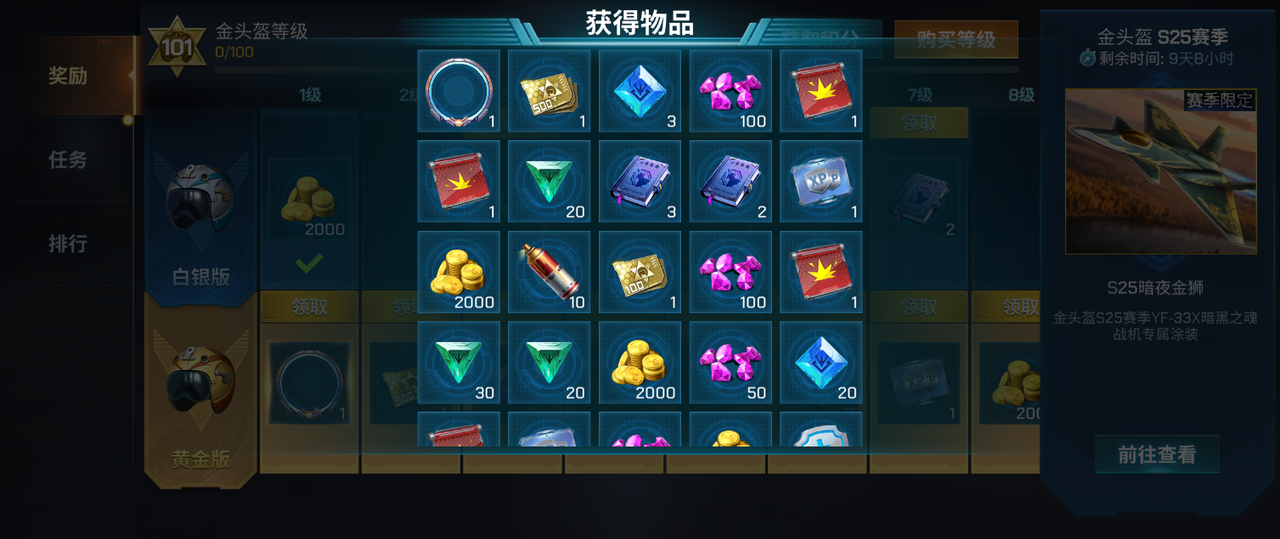 想冲更猛的奖励?黄金版任务安排上!升级后每周 5 个高阶任务,完成直接领取 120 积分,直接爽翻~不管你是只想轻松攒积分的休闲玩家(等级包你值得拥有),还是想把奖励薅秃的硬核大佬,金头盔任务都给你架好了 “积分高速路”!每周 10 个任务轮着刷,积分哐哐涨,兑换奖励拿到手软,S25 的空战物资库,全靠这些任务给你塞得满满当当!