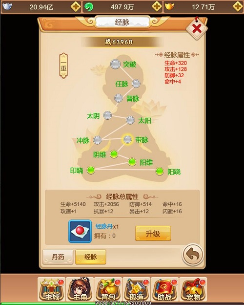 经脉,当人物等级达到95级时,即可开启。经脉分为10大经脉,分别为阳跷、阴跷、阳维、阴维、带脉、冲脉、太阳、太阴、督脉、任脉。每一个经脉增加的属性不同,当每一条经脉打通,即可进入下一个等级的经脉系统。经脉的养成较为简单,只要消耗经脉丹即可打通。而经脉丹,不仅可以通过帮派守护和师徒任务获取,也可以通过威望商店进行购买。