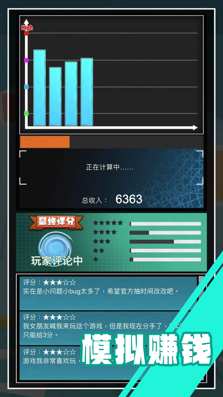 这是一款轻松简单休闲的运营游戏。通过慢慢培养自己的员工,慢慢可以做出更棒更赚钱的游戏
