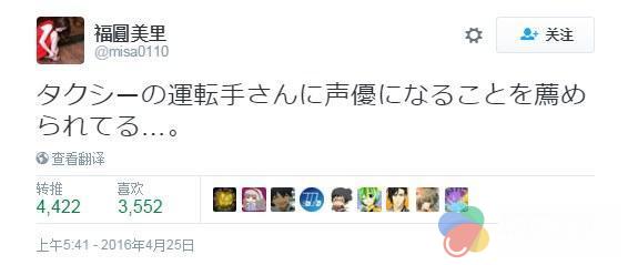 在推特当中,她说道:“一个出租车司机推荐我应该去当声优……然后还说什么,如果不当声优太可惜了,最好意识到自己的才能吧(笑)。”