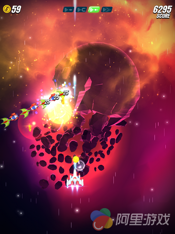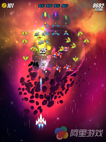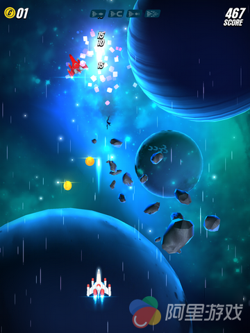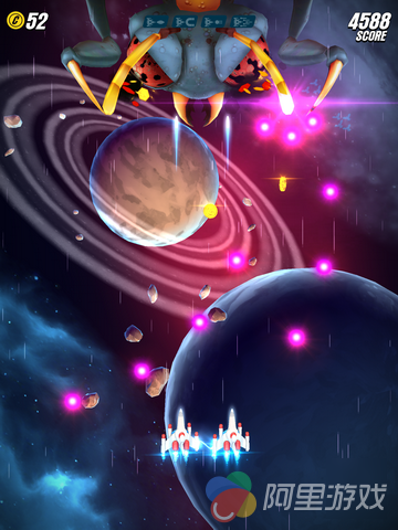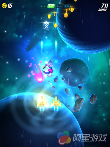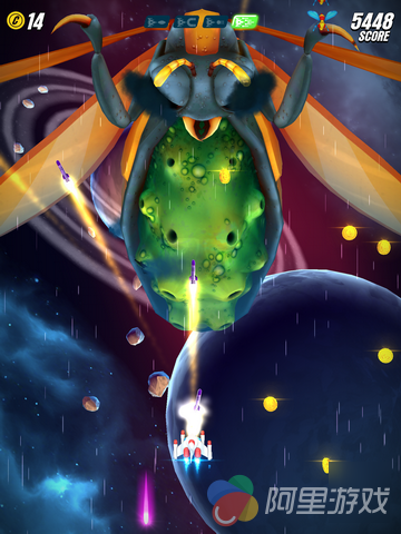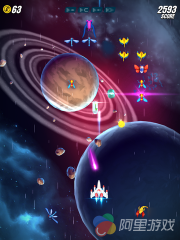 游戏在玩法上继承了1981年南梦宫在街机上推出的游戏《Galaga》的玩法,玩家将控制着自己的战机在宇宙中对抗各种类型的敌人,不同的敌人会有不同的攻击方式,比如发射光波或者直接超你飞撞过来等等。当然,面对敌人的变强,咱们也不能坐以待毙,游戏中加入了类似于RPG游戏当中的升级系统,玩家可以同时金币来对飞机进行强化,从而提高战斗能力。而到了具体的对战当中,我们也可以通过敌机掉落的道具进行短暂的升级,玩起来非常酷炫。除了以上介绍的内容之外,原版游戏中我们熟悉的伙伴系统也重新上线。只要玩家在对战的过程中解救了同伴,就能获得暂时与其“比翼双飞”的机会。