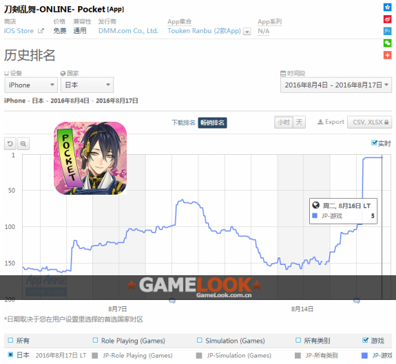 但是由于手游版与页游账号服务器互通,所以移动版在上线后并没有掀起多大的波澜,畅销榜的成绩一直都在百名开外。但是在8月16日举行的限定活动中,《刀剑乱舞pocket》在日本地区畅销榜的排名已经一路升至第五位,这也是该作上线以来最好的成绩。