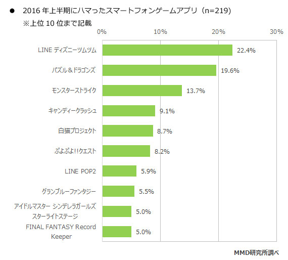 GameLook报道/在今年4月份的时候,AppAnnie发布数据称2016年Q1,中国iOS营收已首次超过日本,跃居全球第二,但是对于全球移动游戏市场来说,日本地区依旧是一个非常庞大的市场。日前,日本MMD研究所发布了“2016上半年智能机手游使用情况”,调查以565名20~69岁智能手机用户为对象进行具体分析。