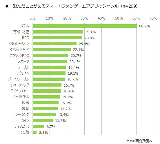 以565位智能手机用户为对象,其中经常使用智能手机进行游戏的用户的数量占到了52.9。然后以其中的299位手游玩家为对象,60.2%玩家玩过益智解谜类的游戏,接下来是养成类的手游,占到29.1,而RPG类的游戏也占比28.8。