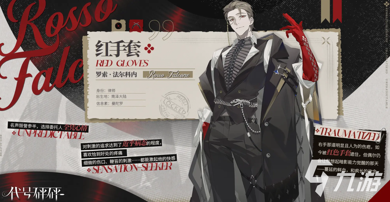 游戏中红手套这个角色整体的外形还是非常出众的,是一个比较高挑的形象,主要是穿着西装,整体的风格也比较的正经,但是跟自己的个性反差还是比较大的,在游戏中,他比较喜欢刺激,可以很好的来推动剧情,它的职业背景是一个律师的身份,在南泽的大陆上生活,喜欢曼陀罗这个信息素,因此穿着风格也和这个信息素有很大的关系。