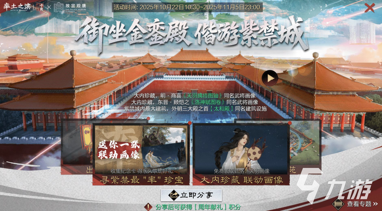 联动于2025年10月22日正式开启,可在【率土庆典】中进入【故宫观唐联动】专题界面。这次联动不仅能让玩家在游戏中探寻古代名画背后的故事,更能在紫禁城恢宏的意象下,体验独属于三国与宫廷文化融合的独特氛围。活动主界面还可分享获取【周年献礼】积分,解锁更多专属奖励。