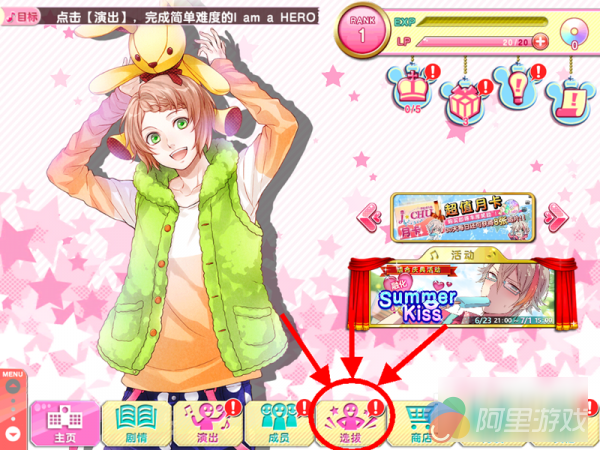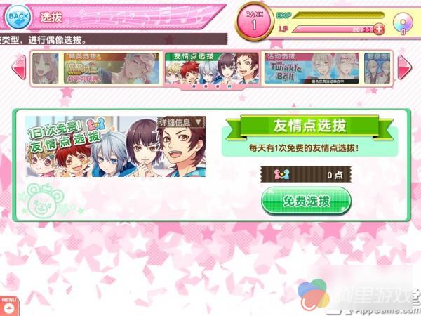 利用友情点Pt进行选拔,友情点可以通过【演出】、登陆奖励、支援好友报酬等方法获得;