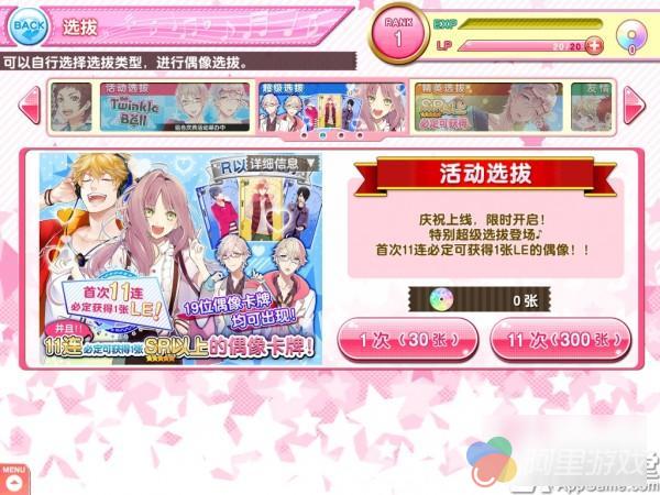 活动选拔每期有一个不同的主题,会包含一些特殊的LE、SR级的优秀偶像卡。
