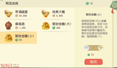 按照传统的方式,我们只能将一仙玉兑换为100金或一万银,但是现在如果我们先使用仙玉购买了“聚财金蟾”,那么我们将会比以前多一分回报。我先介绍一下“聚财金蟾”:“聚财金蟾”分一大一小,大金蟾售价499仙玉,小金蟾售价99仙玉;每周大小金蟾各自可购买一次,根据我对的亲身经历得出的,帮派活动时间内不可以开启金蟾(比如帮战活动全部结束才可以开启,即22点;人参果和帮派强盗没有试验过,有兴趣的玩家可以试验一下)。