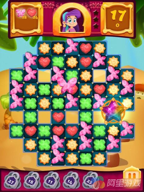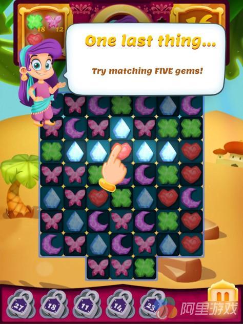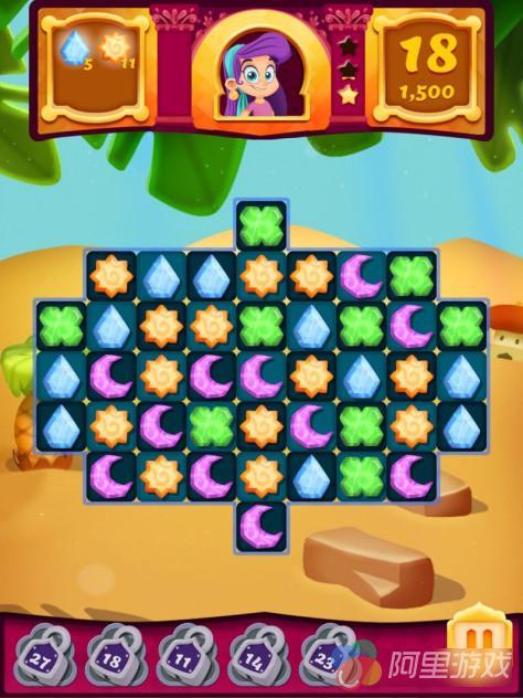 《魔法黄昏(Magic Nightfall)》的画面采用2D竖版屏幕呈现,整体画面看起来非常的清晰,再搭配上极为卡通的画风,将为玩家们带来很舒服的视觉体验。而且由于游戏中存在着各种卡通化的呆萌小动物,所以本作对于妹子玩家来说也有着不小的吸引力,毕竟女孩们可是消除游戏的主力人群呀。此外,独特的阿拉伯场景也为游戏增色不少,主角会站在飞毯上移动,还能遇见绿色的邪恶神灯,看起来还是很别致有趣的。