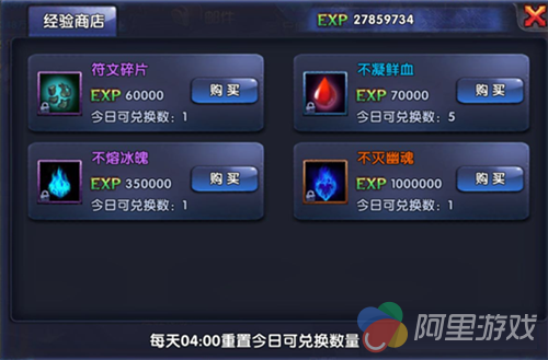 2.经验兑换:主城最左边仓库附近找到二喵,即经验商店,点开即可兑换符文碎片。每天凌晨4点重置兑换次数。