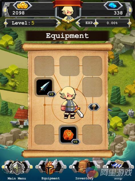 《消磨任务(Grinding Quest)》中的装备系统十分完善,它不但将装备种类分为武器、盔甲、饰品等8个种类,还为这些装备都设计了颜色等级制度,等级从高到低分别为:金色、橙色、紫色、蓝色、绿色、棕色和灰色,而且每种武器除了基础属性外,还有着随机生成的特殊效果,给人一种《暗黑破坏神》的即视感。此外,你还可以使用宝石来对装备进行强化和升级,宝石可以使用金币在商店中换取。