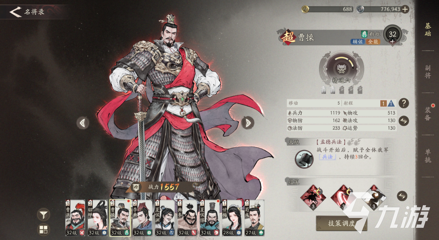 曹操曹老板作为其中的主要角色,具备超强辅助能力,给友方带来超多增益buff,输出上面也还比较可观,作为超级别武将的他,完成任务还有亲兵赠送,在升迁方面会相对简单,也是从初始一直能使用到后期的角色,整体的实用性和培养价值都是比较高的。而且其他武将都没有光环,他就可使用光环技,能对范围内武将技能和战法都提供增伤。自带计策使敌方受到145%单体损伤,携带兵法,还能回复战意。