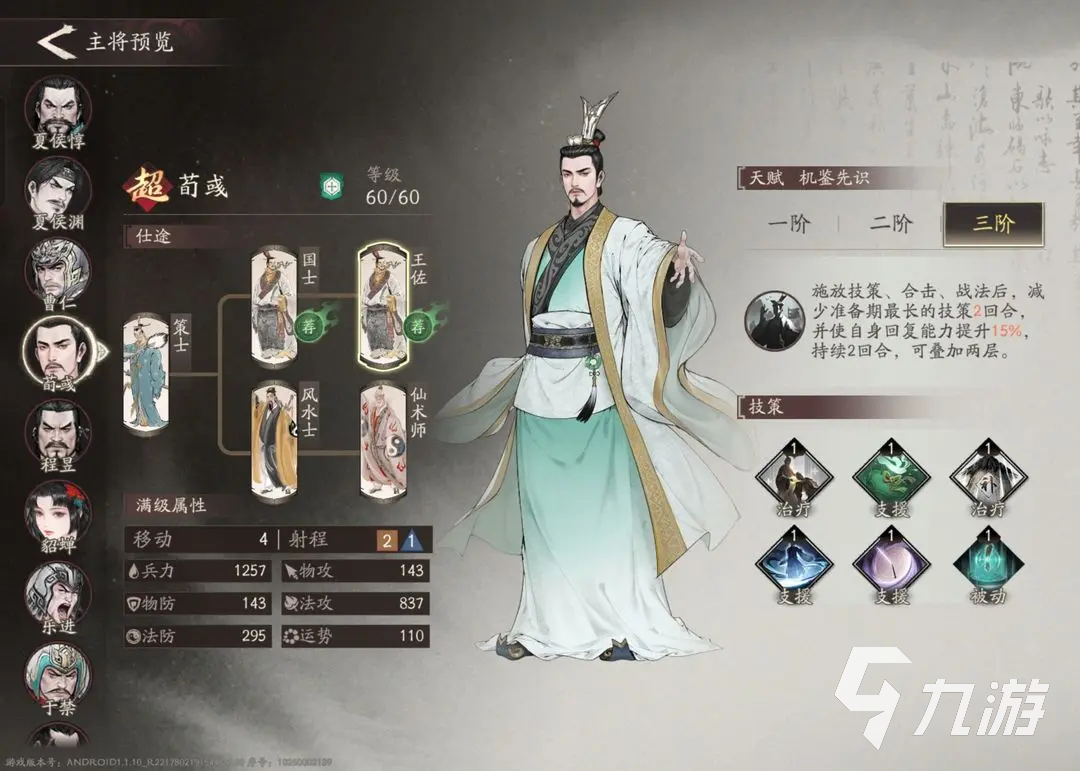 他的技能“观星”可以让他在游戏开始时获得额外的手牌,增加了他的生存能力和筹码。