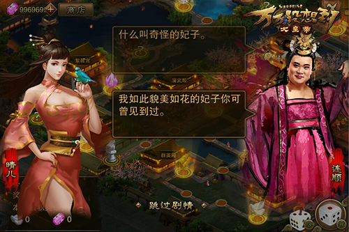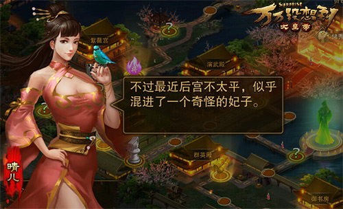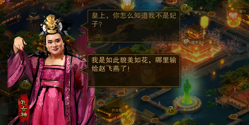 清纯可人的东瀛公主,温婉秀丽的赵飞燕,狂野性感的匈奴公主,才貌双全的步练师,四种风格的美丽,总有一款适合你。整个后宫呈环状,最中间是诸位美人所在的储秀宫,还有御膳房、演武殿、御书房等建筑。后宫游园的玩法类似于“大富翁”,玩家通过掷骰子的形式决定走的步数,在不同的地点会触发不同的事件,有知识问答、美女猜拳、求签祈福、御风池搓澡等。
