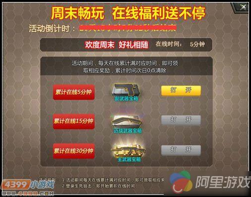 4399生死狙击周末痛快玩,5月13-5月15每日在线,神器轻松领!在线5分钟可领取副武器宝箱,在线15分钟可领取近战武器宝箱,在线30分钟可领取主武器宝箱! 每日战斗还有GP宝箱等你赢取!