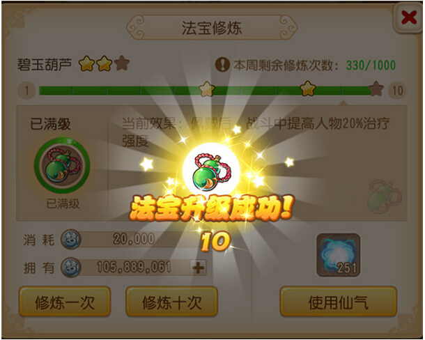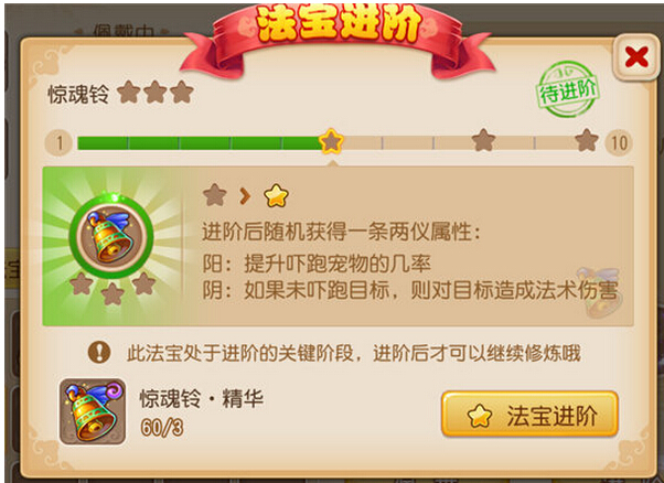 在你拥有法宝之后,你可以消耗仙气或银两将其升级。而在5/8/10层时,法宝进阶系统也随之开启。每一次法宝进阶,都会附加一个两仪属性,你可以根据自己的需求,选择“阴”或“阳”两大进阶路线之一,赋予法宝全新的发展方向。