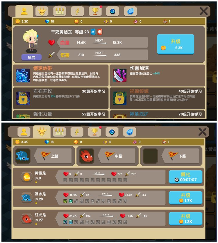 游戏的玩法本质上与其它挂机游戏大同小异,加入转生系统让游戏生生不息。不过本作在关卡中将兵线丰富到三路,增加了操作要求也增加了战略性升级需求,龙宝宝不同的技能决定了它的站位优劣势,武器系统带来的不同特效也很大程度上影响了战局,玩家有必要根据关卡特点改变自身搭配。只可惜本作每个关卡都采用相同的战斗系统,仅仅是背景图更换。