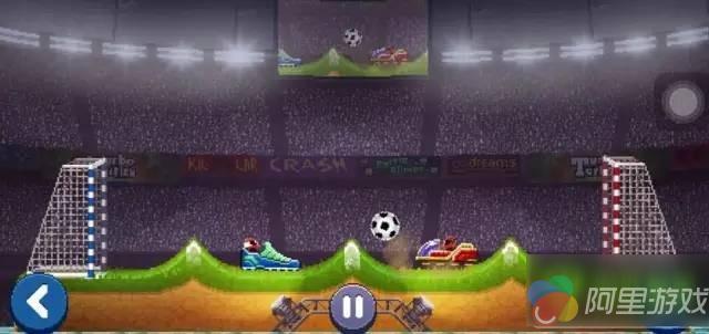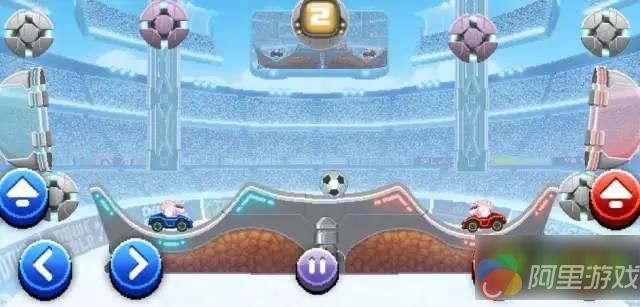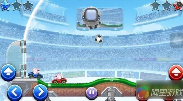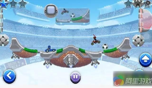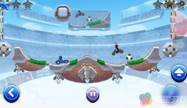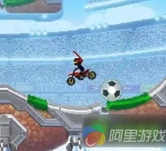 但这种情况的尴尬在于,只要足球出现在玩家的后方,那么输的几率就变的非常大,因为足球与机车几乎同样高度,玩家只能利用地形来“飞”到空中调换与足球的位置,但操作失误就会将皮球踢进自家球门。