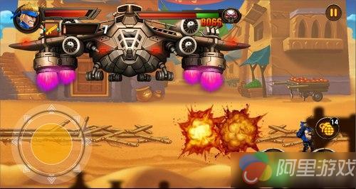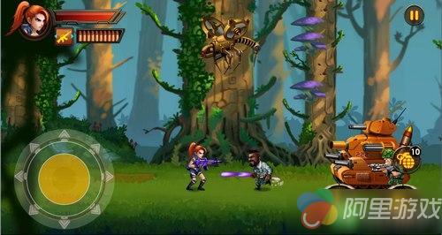谈到这款游戏的操作,其实并不复杂。本作保留了那种《合金弹头》式的简单操作,虚拟摇杆控制左右移动,以及四向射击,同时还支持斜角度向上射击和下蹲攻击,操作花样繁多。而屏幕右下角只有跳跃、攻击和手榴弹三个按钮。手榴弹是限量的,但是可以在战场中获取。而攻击武器的枪械也有多种,高级的攻击武器也可以在战场中获取,不过是限量的,我们可以在屏幕的左上角切换使用。