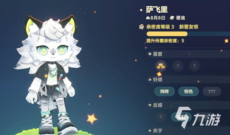 萨飞里是塔法星球上的原著居民,他出生于8月8日,是典型的狮子座性格。在喜好上他喜欢烧烤、棕色等,反感浴缸。玩家可以根据他这些性格喜好选择他喜好的礼物,选对了礼物也加速好感度的提升。