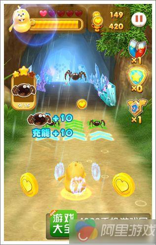 《嘟哒快跑》中的主角是一个非常可爱的小硕鼠,圆润的身体看起来就像一个土豆一样,奔跑的动作也充满喜感。游戏采用了竖版3D引擎呈现,茂密的森林看起来非常神秘,再加上路上各种闪闪发光的宝藏,确实让人有一种小激动的感觉。本作以卡通Q萌的风格制作,画面细节的表现并不算优秀,不过整体上给人非常灵动可爱的感觉,对于小朋友们的吸引力肯定更大。