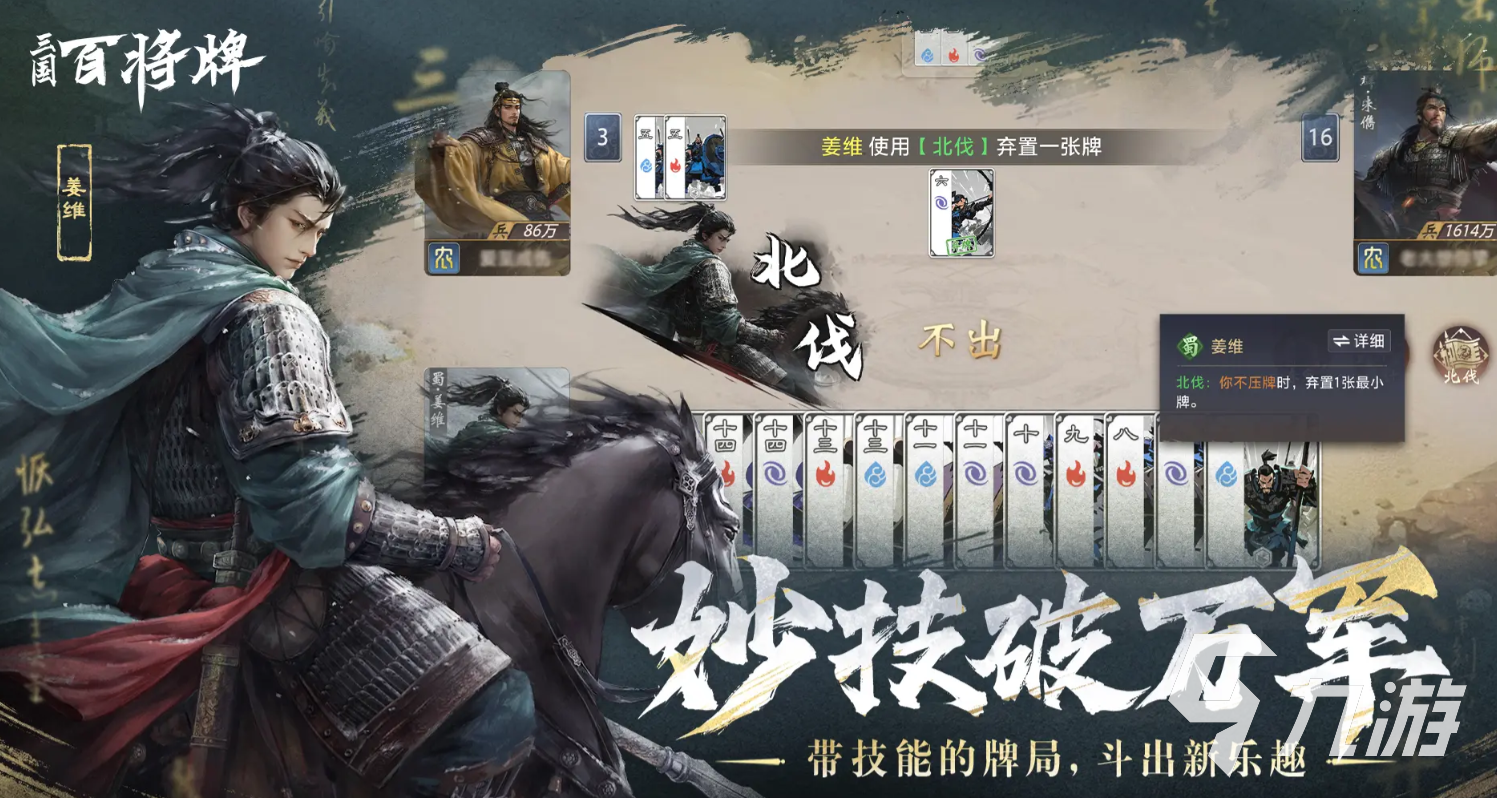 姜维的“绝计”会在我们有1张牌且不压的时候,将该牌的点数随机变大,该牌如果是大王,会直接变成4个3,他的“北伐”能在不压牌时弃置1张最小的牌。