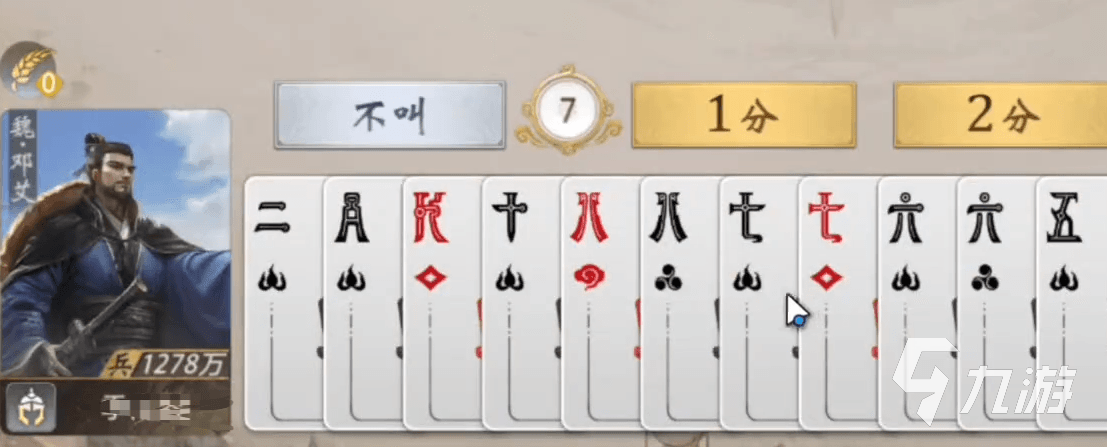 邓艾的“屯田”会在其他玩家出牌小于或等于4张时,自己选择不压就积攒1点粮食,被动兵粮能在有2点粮食时获得一张小王,有3点的时候兑换一张大王,有4点的时候兑换一张万能牌。