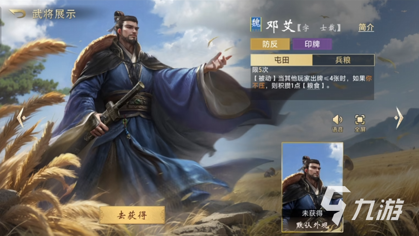 隶属魏国的邓艾,立绘有点像温文儒雅的侠士,手中拿着佩剑,十分具有文人风骨,他的主要能力是防反和印牌。“屯田”的被动效果可在对局中发挥5次,当其他玩家打出的牌小于等于4时,如果己方不压,就可以积攒一点粮食。