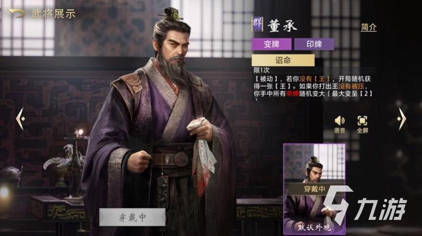 群雄的董奉,中年比较威严的形象,硬朗,孔武有力,他的技能特色是变牌和印牌。“诏命”就是他的技能,只能使用一次,是个被动技能,如果自己手上没有“王”,开局随机获得1张“王”,如果打出“王”没有被压,自己手里所有的单牌都会随机变大,最大会变成“2”,这个被动还是非常有意思的,“王”是最大单牌,获得这个牌则是得到了单牌中最大压制效果,而将其他单牌随机变大,则让手中单牌有机会变成对子,总之该技能能让自己对局拥有很大优势和反制能力。