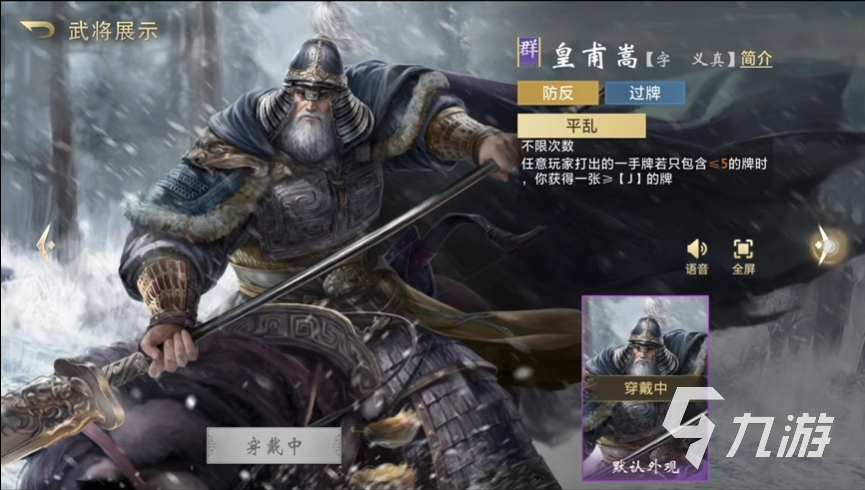 从形象看来就是在战场游刃有余的将军,给人以强烈安全感,作为群雄武将,技能主要效果围绕着”防反“和”过牌“展开。他的技能使用是不限制次数的,任意玩家打出一张手牌后,如果只包含小于等于5的牌时,自己可以获得一张大于等于”J“的牌,也就是说这个技能在合适时机,可以获取一张大牌,而此时对手手上只有小牌,是必然可以通过获取的牌来压制对手的。