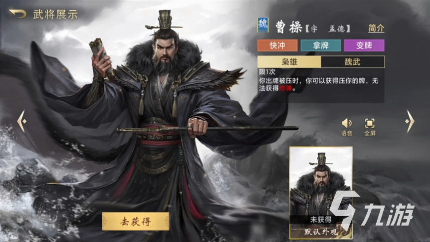曹孟德的技能是“枭雄”,在自己出牌被压时,可以获得这张压自己的牌,不过不能获得炸弹。