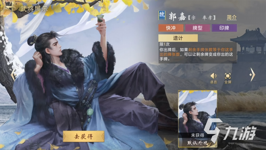 郭嘉郭奉孝的形象明显十分年轻,立绘看着就潇洒又帅气,符合古人美男子的设定,在对局中擅长快冲。技能“遗计”,出牌之后,如果手上剩余牌的数量等于本次自己出牌的张数,可以直接让剩余牌变成出的手牌。这个技能虽然只能发挥1次作用,但是如果打出去的这次牌对手都要不起,再出一次同样的牌,直接将手中牌出完,就能直接获胜。