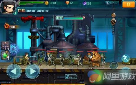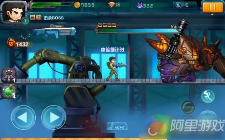 本作采用的是按键的操作设计,这款作品并没有采用虚拟摇杆,玩家只能控制角色向左右两个方向射击。只有在居高临下的时候才可以往下方自动射击,因此在攻击方面比较单调。游戏的操作按键分布在屏幕左右下方,左下方是左右移动,右下方是近身武器、枪、跳跃以及切换武器几个功能按键。