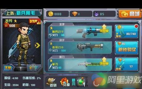 谈起2D横版设计,在经典魂斗罗以及合金弹头之后的作品,多多少少总会带着他们的影子。本作从玩法的角度来说与经典比较类似,在操作上采用了更加偏向移动端操作习惯的设计。仅从画面的角度来说本作并无太多的特色,卡通风格的画面亦是当下的趋势。游戏并没有设计丰富的故事背景,从进入游戏以后便开始了战斗。这款作品在游戏界面的设计上很饱满,各种功能按钮的指向性不太明确。比如点击进入强化装备的界面以后,并没有设计返回键,需要点击装备库按钮返回上级界面才可以点击开始游戏按钮,从操作习惯上来说也许有些不够方便。