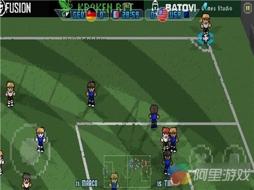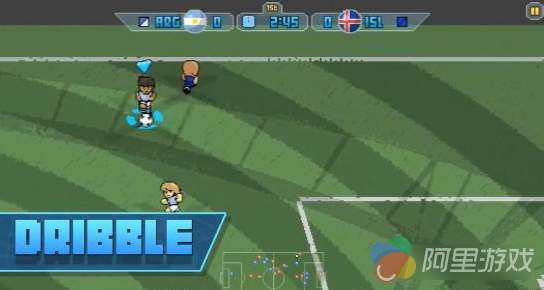 至于玩家比较关心的操作方面,《复古足球》则采用了更加适合手机操作的点触式操作方法。玩家在进攻阶段通过点击本方队员就可以将足球传递过去,而如果当前视野当中没有己方队员,也可以按住场地中的一点,这样球就会自动传过去,同时距离此地最近的球员也会跟上,不过这样传球有一定的风险,比较考验玩家的预判。至于射门则只需要向球门的方向滑动即可,完全靠玩家对于角度的把控能力。而至于防御阶段,游戏则夸大了铲球的效果,玩家轻轻一划,就能在地面上出现一条长长的痕迹,效果相当劲爆。当然这样做可能也存在风险,一旦把握不准,分分钟一张黄牌警告。