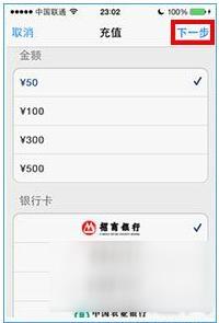 5、接下来选择要充值的金额,选择要付款的银行,点击右上角的“下一步” 继续,如图所示