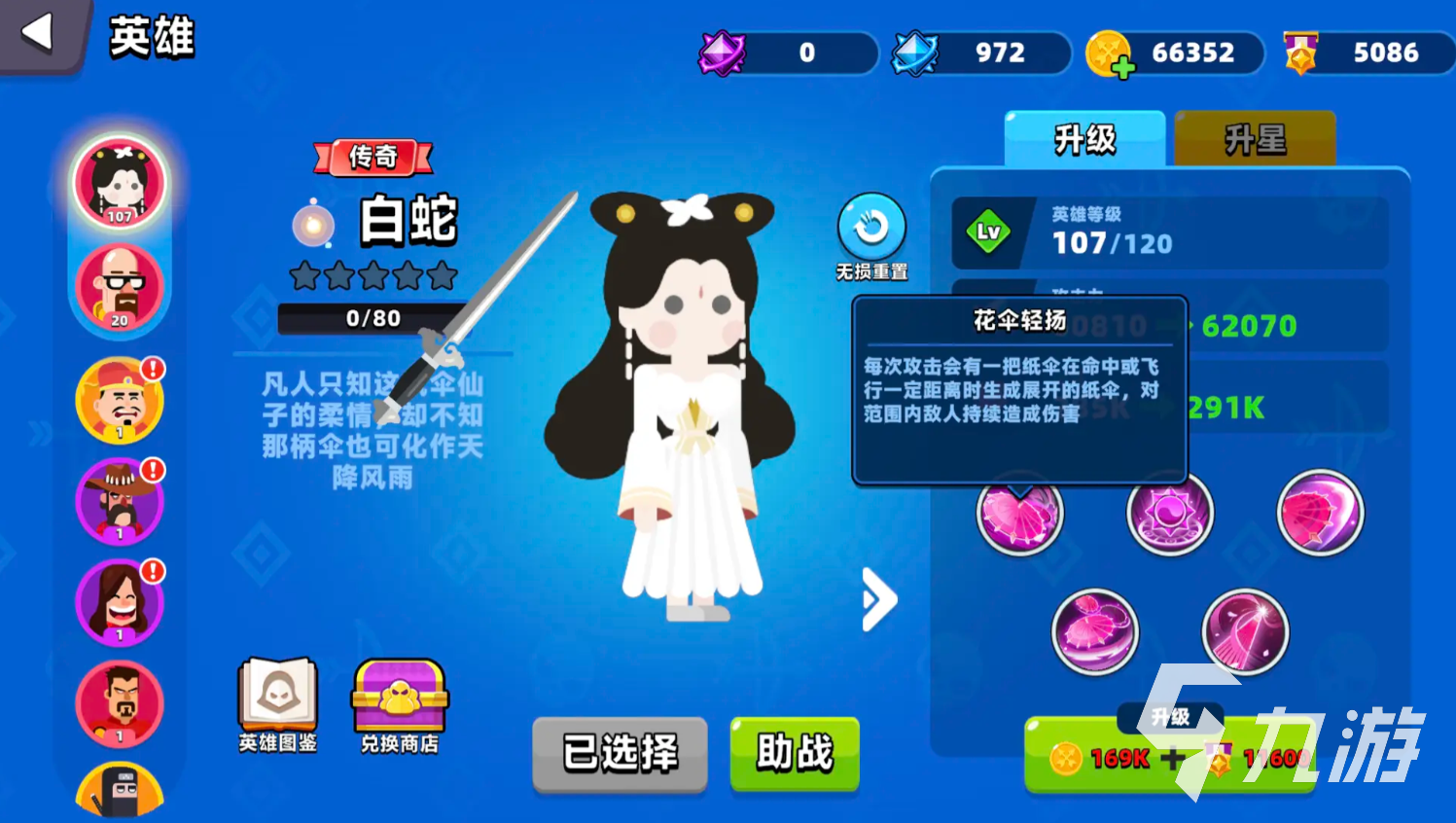 最后为大家推荐的就是白蛇,这个角色是活动当中更新的一个角色,白蛇实力的话就要看她的技能,她在本身的属性上面还是有比较多效果的,目前可以用的有5个技能,不过在她的所有技能里面比较有特性的还是花伞轻扬这个技能,带来的整体输出能力也是最好的,其次还有一个旋伞飞花的技能,这个技能使用之后角色会展开手中的伞,并且根据伞旋转的方向来向周围带来光波伤害,她的光波伤害是带有自身属性的,而且这个角色在使用了技能之后,还可以多另外几发射杀效果,所以在攻击能力上面,她有很多范围输出,在一些关卡里面,这类范围输出使用效果更强的情况下,还是比较推荐使用白蛇的。