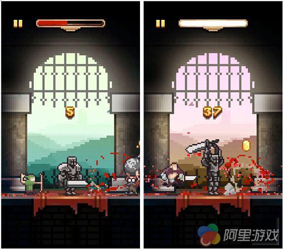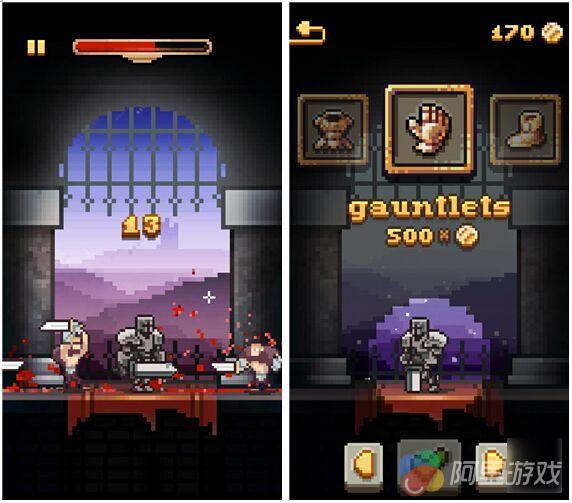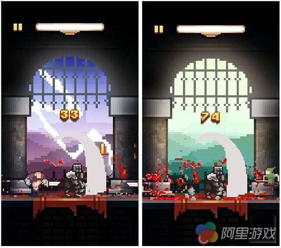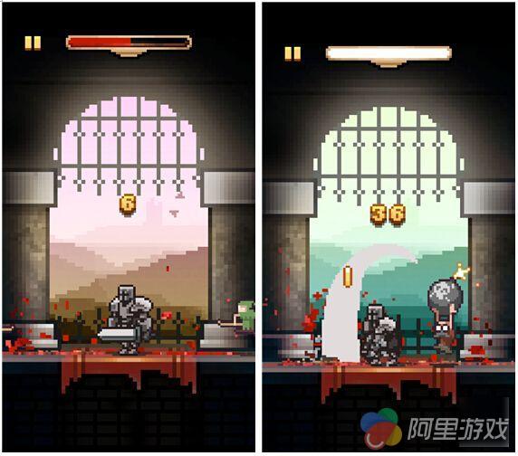 毫无疑问,像这样的休闲作品一定会采用时下流行的像素画风,在这里只见一个身披厚重铠甲的骑士孤独地站在城堡大门,甚是有一夫当关万夫莫开的气势,而游戏全程的视角就固定在这里,所以就别指望有什么场景深度了,不过背景颜色会随着每一次挑战不断变化,其实要通过这样的方式保持新鲜感显然是不够的。