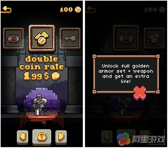 随着击杀的敌人越来越多,我们也可以收集更多的金币,这些金币的唯一用途就是购买装备,比如加强盔甲,武器,获得一个额外的生命等等,单一提升某个部位其实并没有多大效果,要是全部都提升起来的话那就大大增加了人物的生存能力,但是有一点不得不说的是,这里的金币相当难赚。