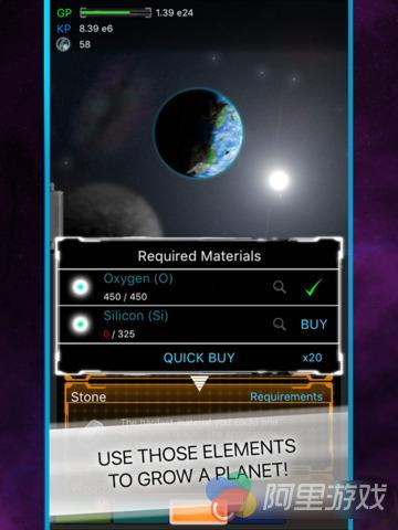 在游戏刚开始的时候画面中还是一片漆黑,什么东西都没有,而当玩家点击屏幕之后在画面中就会出现一些绿色的粒子,这些粒子非常活跃,出现之后将会聚集在一起,而且随着玩家的点击次数越来越多,积累起来的粒子也会越来越多,在画面左上角会显示玩家当前所拥有的粒子数,也就是GP值,而玩家可以升级自己的相关属性,让玩家每一次点击所获得的GP值增加,而且玩家可以积累的GP上限也会增加。当GP值积累到一定程度之后,玩家就可以开始创造元素了,所有的物质都是由元素组合而成的,玩家直接点击即可花费GP值购买和进化这些元素,这些元素将会是未来所有物质的基础。