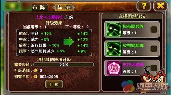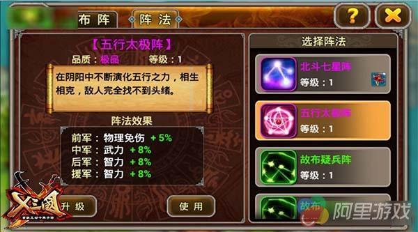 众所周知,五行指金、木、水、火、土。大自然由五种要素所构成,随着这五个要素的盛衰产生变化,不但在危险重重的战场上影响到武将的命运,同时也使战场上充满了不确定的危险!有了五行太极阵,可以保证各位主公战场达到阴阳平衡状态,而让敌人在阴阳的不断演化中,完全找不到头绪!在《兵临三国》,前军加免伤,中军武力,后军和援军智力加成都不俗,值得你入手!
