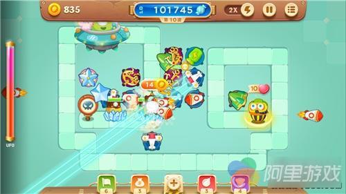 有好的自然就有坏的了,在UFO受到攻击掉落糖果的同时,他也会将萝卜丝们建好的炮塔吸走,当炮塔被吸走的时候也千万不要惊慌,只要立刻在被吸走原来的位置再次安放炮塔对UFO持续的输出就可以了~还需要注意一个问题,UFO会伴随怪物一同出现,所以推荐大家选择带穿透效果的炮塔效果会更好哦!