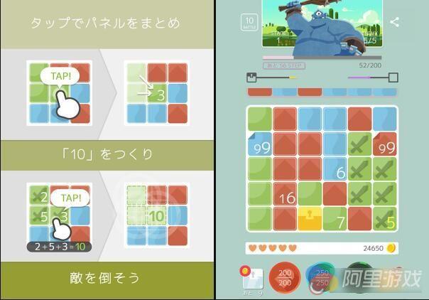 本作是一款解谜类的RPG游戏,玩家在游戏中可以通过解谜的方式来继续自己的冒险之旅。玩家在游戏中可以通过点击彼此响亮的方块来让方块上的数字产生不同的变化,系统将会根据变化的数值来给予敌人一定的伤害。如果玩家可以加减乘除算出10或者10的倍数的话,就可以将所有的板块消除,给予敌人极大的伤害。