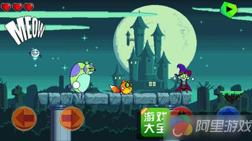 画面左上角的三颗爱心代表可消耗的生命值,要时刻关注它们的生存情况。闯关的时候不仅能左右移动也可以向上跳跃,因而还要小心可能出现在头顶的炸弹怪或者别的飞行系怪物。被攻击的时候如果不想躲开,就要点击那个猫爪图标用自己的武器抵消攻击或者进行反击,消灭掉敌人。