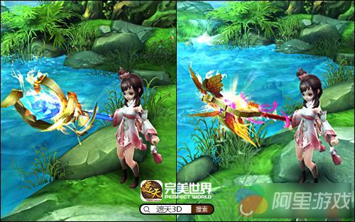 元灵小萝莉的花杖类神兵设计独到,且与其自然灵性相贴合,以花叶、尾羽、翅膀等元素进行勾勒,既华美却又不失灵气。