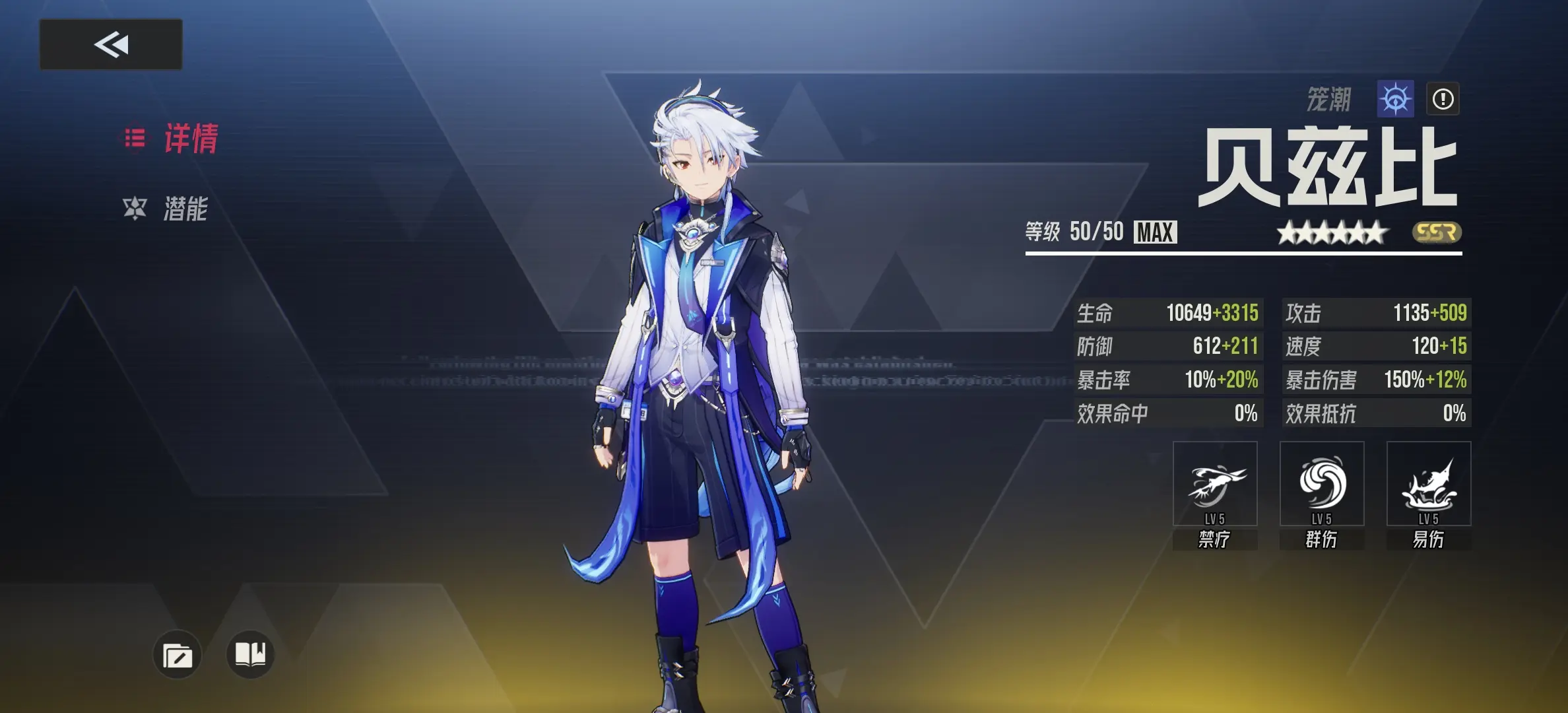 先来看一下属性面板实力真的是一点都不含糊。基础生命值会达到10,649,并且还会额外的增加3315,续航的底子还是很扎实的。攻击力是1135,加上509的加成,输出的能力很不错。防御力是612,并且还会有211的增幅,并不算特别的脆。速度是120,加上15出手的节奏也是比较舒服的。暴击属性也会很亮眼,基础暴击率10%+20%的加成暴击伤害是150%加上12%。在打控制还有爆发时都会很有保障。