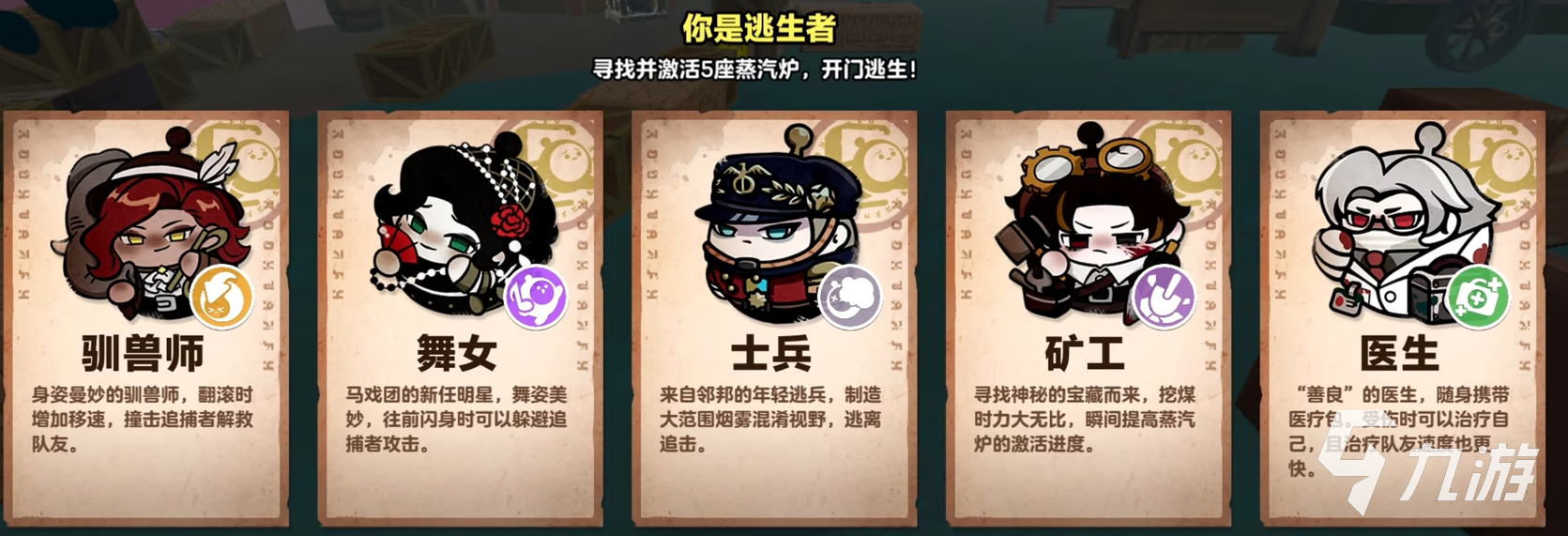 在开始之前逃生者的玩家可以选择职业和专属技,不同职业的定位各不相同,有干扰、救援、牵制和专注填充燃料等,合理搭配能便于实施不同的策略,从而有助于逃出,同样追捕者蛋仔也可以挑选心仪角色,不同角色有着不同的技能,像是疯象莫比可以在柜子中自由穿梭等,灵活运用职业专属技可以将逃生者尽数抓捕。